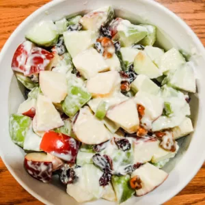 Traditionally, the Waldorf salad consists of chopped apples, celery, and walnuts dressed in mayonnaise. It can be served over lettuce or on its own. However, the mayonnaise adds unnecessary calories and fat to the salad. Honestly, during the holidays, I’d rather spend those calories on the iced gingerbread cookies that I cannot stop eating.