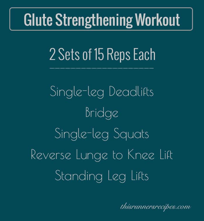 There’s a couple details to keep in mind for effective glute strengthening. First, you want to make sure that you engage your glutes as you exercise them. This means you want to tighten your glutes as you perform these exercises, just as you would pull in your abs while in plank position. Secondly, you want to plan your glute strengthening exercises around your runs. Add a few moves into your normal strength routine, and avoid doing these exercises the day before a hard running workouts, so you don’t over-fatigue the muscles. I recommend doing these on easy run days or even immediately after a harder run, and you should aim to do them 2-3 times per week.